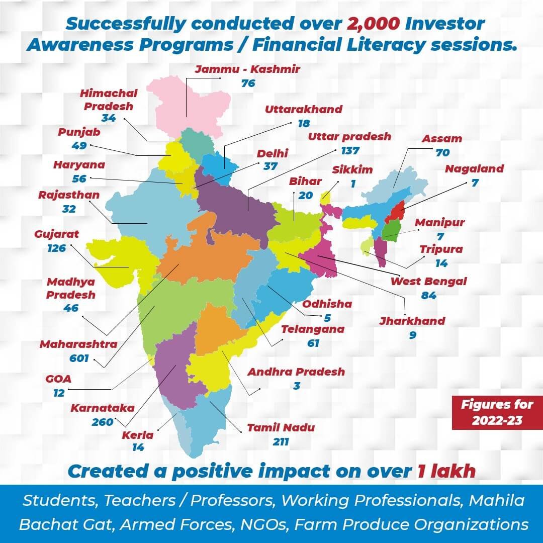 Our prime focus is to ensure qualitative & effective sessions by understanding the fear and restraints that every individual faces and addressing them and help them make informed decisions. We wish to continue doing this good work thereby spreading Investor Awareness through an organised manner by fulfilling all the mandates that a Mutual Fund or Stock Exchange are required to.